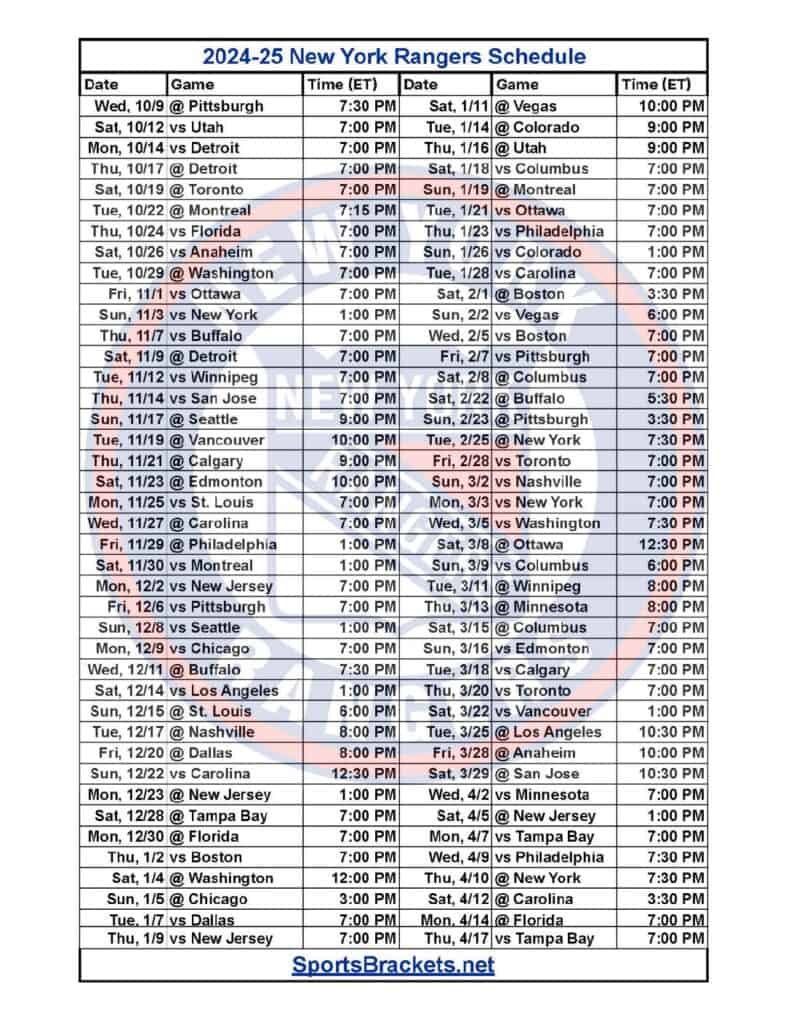 Printable 2024-25 NY Rangers Schedule
