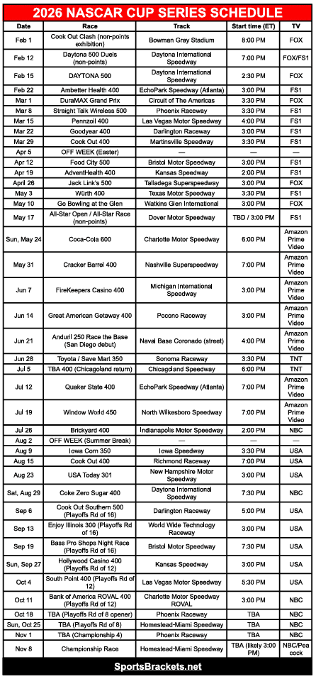 You can also check out the 2026 NASCAR Craftsman Truck Series Schedule and the 2026 NASCAR O’Reilly Auto Parts schedules for the upcoming season.