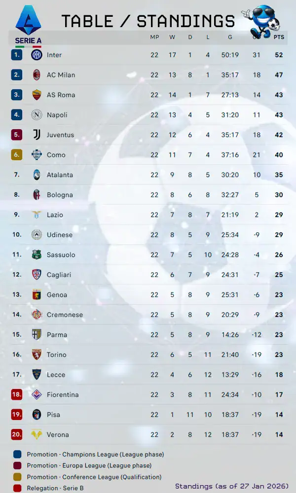 The 2025-26 Serie A standings (table) are updated by the league here. We also bring you the latest on which clubs sit where in the tables after the matches conclude each week as well. Here’s a snapshot for you of where the teams sit after match week 22. We see Inter, AC Milan and AS Roma on the top of the league in points so far. The 17th and 18th place teams get relegated while the 16th place enters a playoff against the 3rd place team in 2. Serie A to see who goes where next season similar to the Bundesliga and other European professional leagues.