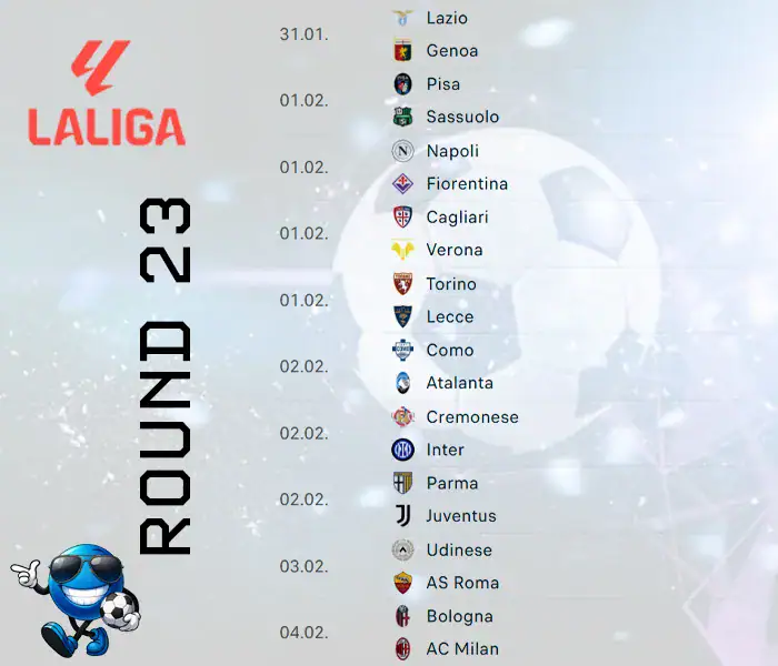 The 2025-26 Serie A schedule is referred to as match weeks each weekend. The matches take place usually on Friday, Saturday, and Sundays and are posted here. The Serie A schedule runs from August 23rd, 2025, to May 24th, 2026, this season. You can see a snapshot of the early schedule for Matchday 23 below. The entire printable Serie A schedule is available in PDF format for you here too.