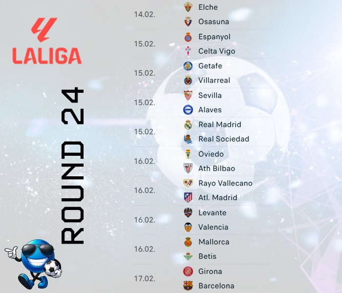 The 2025-26 La Liga schedule is referred to as match weeks each weekend. The matches take place usually on Friday, Saturday, and Sundays and are posted here. The La Liga schedule runs from August 15th, 2025 to May 24th, 2026 this season. The entire printable La Liga schedule is available in PDF format for you here too. Round 24 looks like this.