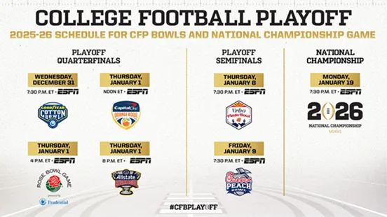 - CFP National Championship – Monday, January 19, 7:30 p.m. ET – Hard Rock Stadium, Miami Gardens, FL – ESPN