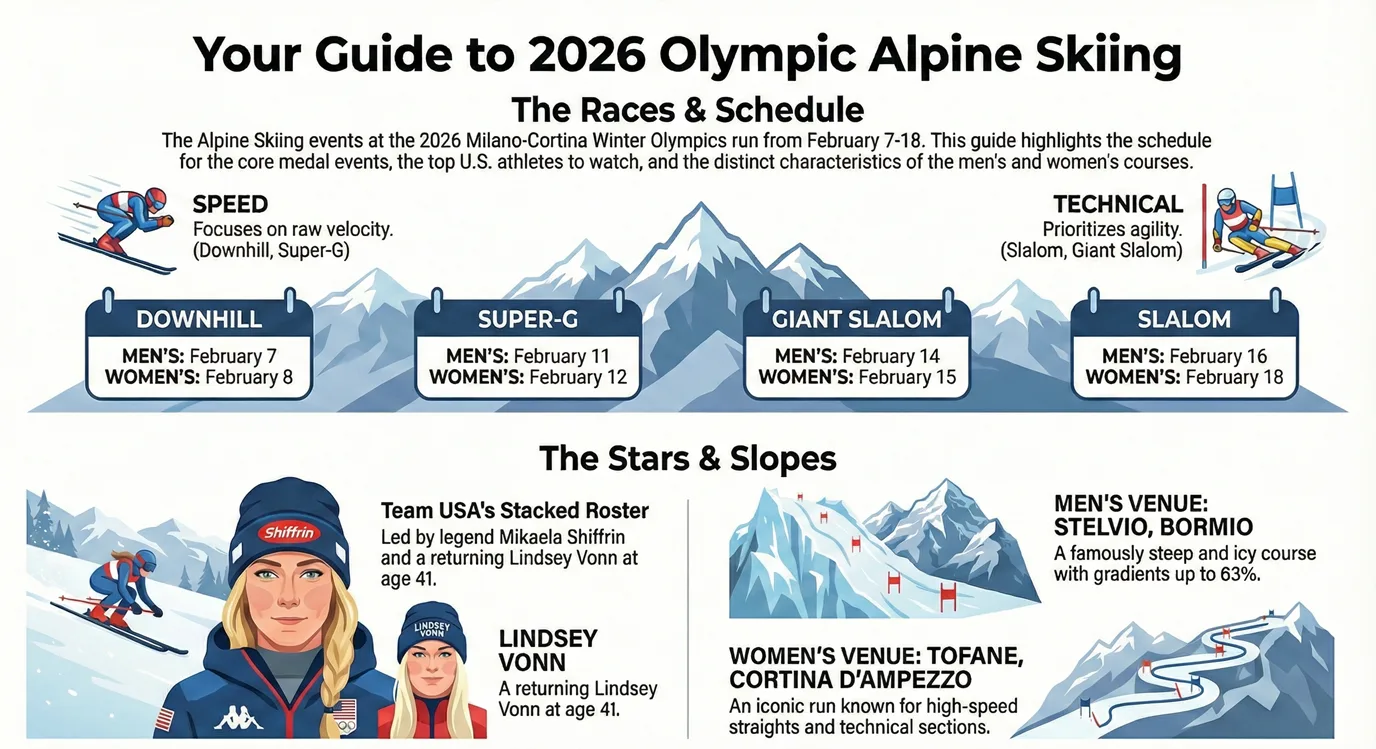 Here is the 2026 Winter Olympics Alpine Skiing schedule for you. The 2026 Milano-Cortina Winter Olympics start soon. Alpine Skiing set takes place from February 7 to 18. As one of the core Winter Olympic sports, Alpine events like Downhill, Super-G, and Giant Slalom will showcase the world’s top skiers battling gravity and icy slopes. With prelims kicking off as early as February 4, this guide covers the full schedule, key races, U.S. medal hopefuls (including Mikaela Shiffrin’s chase for more hardware), venue spotlights, and a free printable calendar/PDF for easy tracking.