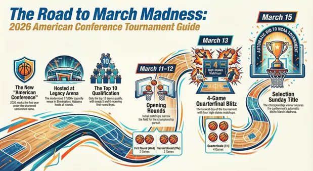 This year’s event marks the first under the shortened “American Conference” name (dropped “Athletic” in 2025) and features a revamped five-day format for the top 10 teams. Held at the Legacy Arena at the BJCC in Birmingham, Alabama this postseason. The champion secures the conference’s automatic bid to March Madness.