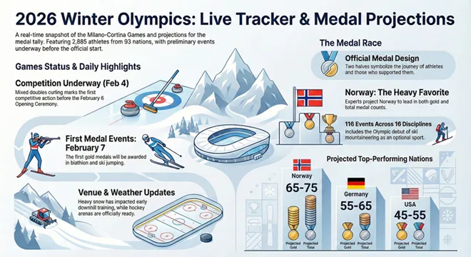 Welcome to the 2026 Winter Olympics Live updates & results tracker for the 2026 Milano-Cortina Winter Olympics. As the Games kick off with preliminary events today (February 4, 2026), we’ll provide real-time updates on results, medal counts, and key highlights. The official opening ceremony is on February 6, but action is already underway with training sessions and the start of mixed doubles curling.