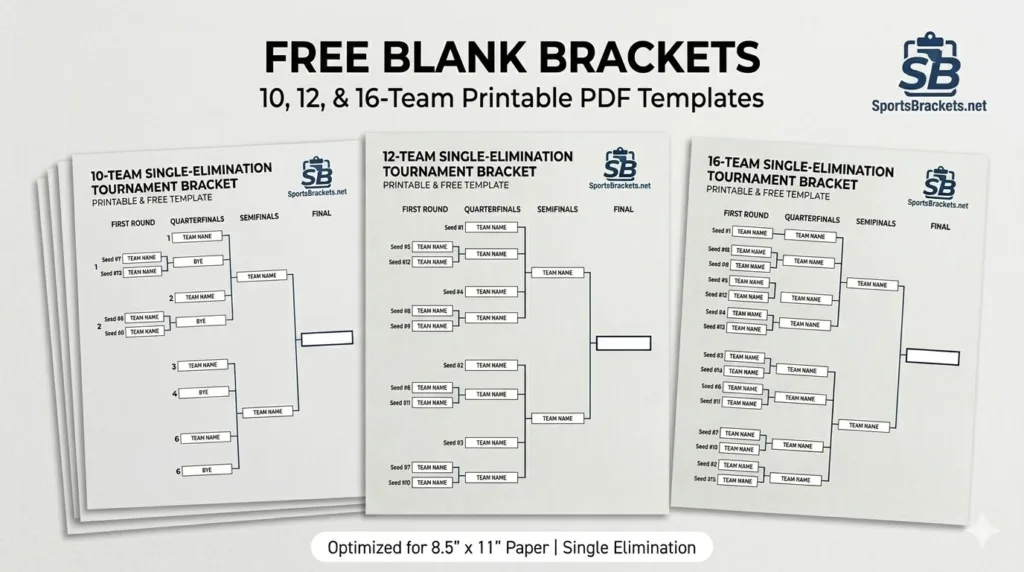 Whether you are organizing a local youth tournament, a pickleball league, or a custom office pool for March Madness, having a clean, professional bracket is essential. Below, we provide free, high-quality printable blank tournament brackets for you. The templates are in PDF and image formats for 10-team, 12-team, and 16-team fields. These brackets are designed for single-elimination play and are formatted for standard 8.5″ x 11″ paper.