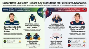 Read more about the article Super Bowl LX Injury Updates & Player Status: Patriots vs Seahawks Key Players (Emmanwori Ankle, Darnold Oblique, Maye Shoulder & More)
